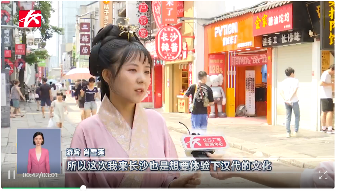 ? ? ? ? 近年来,汉服逐渐受到年轻消费群体的热捧,穿汉服、逛古街,汉文化与文旅消费激情相拥,成为长沙一道靓丽的风景线。目前,太平街从街头到街尾,短短375米,零星分布着十多家汉服馆。优美的线条,古朴的纹样,精致的配饰,汉服馆中处处可见时尚与传统融合,青春与古风共鸣。
